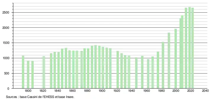 L'évolution du nombre d'habitants est connue à travers les recensements de la population effectués dans la commune depuis 1793. Pour les communes de moins de 10 000 habitants, une enquête de recensement portant sur toute la population est réalisée tous les cinq ans, les populations de référence des années intermédiaires étant quant à elles estimées par interpolation ou extrapolation[23]. Pour la commune, le premier recensement exhaustif entrant dans le cadre du nouveau dispositif a été réalisé en 2008[24].