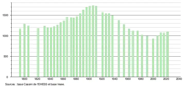 L'évolution du nombre d'habitants est connue à travers les recensements de la population effectués dans la commune depuis 1793. Pour les communes de moins de 10 000 habitants, une enquête de recensement portant sur toute la population est réalisée tous les cinq ans, les populations de référence des années intermédiaires étant quant à elles estimées par interpolation ou extrapolation[24]. Pour la commune, le premier recensement exhaustif entrant dans le cadre du nouveau dispositif a été réalisé en 2006[25].