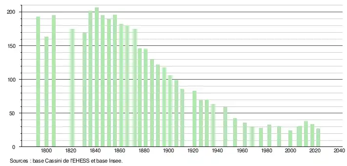 L'évolution du nombre d'habitants est connue à travers les recensements de la population effectués dans la commune depuis 1793. Pour les communes de moins de 10 000 habitants, une enquête de recensement portant sur toute la population est réalisée tous les cinq ans, les populations de référence des années intermédiaires étant quant à elles estimées par interpolation ou extrapolation[20]. Pour la commune, le premier recensement exhaustif entrant dans le cadre du nouveau dispositif a été réalisé en 2007[21].