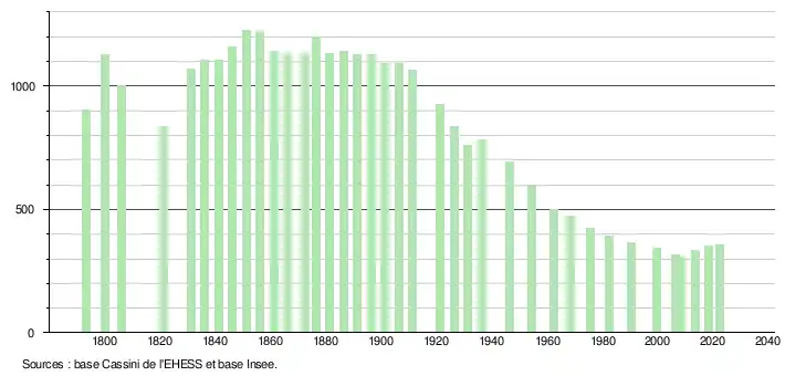 L'évolution du nombre d'habitants est connue à travers les recensements de la population effectués dans la commune depuis 1793. Pour les communes de moins de 10 000 habitants, une enquête de recensement portant sur toute la population est réalisée tous les cinq ans, les populations de référence des années intermédiaires étant quant à elles estimées par interpolation ou extrapolation[23]. Pour la commune, le premier recensement exhaustif entrant dans le cadre du nouveau dispositif a été réalisé en 2008[24].