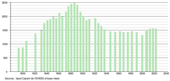 L'évolution du nombre d'habitants est connue à travers les recensements de la population effectués dans la commune depuis 1793. Pour les communes de moins de 10 000 habitants, une enquête de recensement portant sur toute la population est réalisée tous les cinq ans, les populations de référence des années intermédiaires étant quant à elles estimées par interpolation ou extrapolation[26]. Pour la commune, le premier recensement exhaustif entrant dans le cadre du nouveau dispositif a été réalisé en 2007[27].