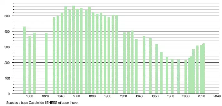 L'évolution du nombre d'habitants est connue à travers les recensements de la population effectués dans la commune depuis 1793. Pour les communes de moins de 10 000 habitants, une enquête de recensement portant sur toute la population est réalisée tous les cinq ans, les populations de référence des années intermédiaires étant quant à elles estimées par interpolation ou extrapolation[19]. Pour la commune, le premier recensement exhaustif entrant dans le cadre du nouveau dispositif a été réalisé en 2004[20].