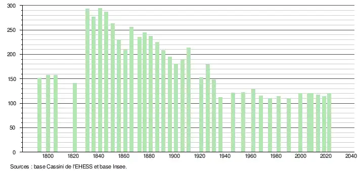 L'évolution du nombre d'habitants est connue à travers les recensements de la population effectués dans la commune depuis 1793. Pour les communes de moins de 10 000 habitants, une enquête de recensement portant sur toute la population est réalisée tous les cinq ans, les populations de référence des années intermédiaires étant quant à elles estimées par interpolation ou extrapolation[16]. Pour la commune, le premier recensement exhaustif entrant dans le cadre du nouveau dispositif a été réalisé en 2008[17].