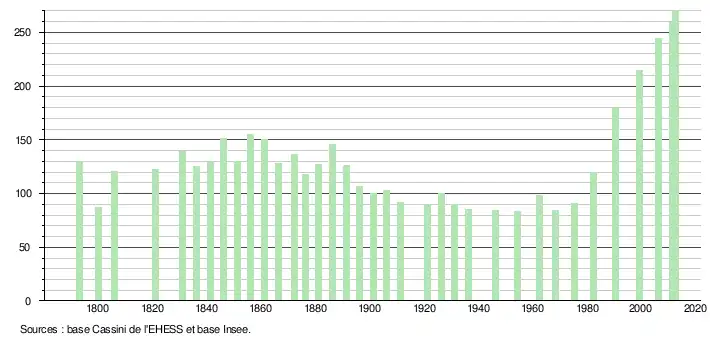 - ↑ Par convention dans Wikipédia, le principe a été retenu de n’afficher dans le tableau des recensements et le graphique, pour les populations légales postérieures à 1999, que les populations correspondant à une enquête exhaustive de recensement pour les communes de moins de 10 000 habitants, et que les populations des années 2006, 2011, 2016, etc. pour les communes de plus de 10 000 habitants, ainsi que la dernière population légale publiée par l’Insee pour l'ensemble des communes.