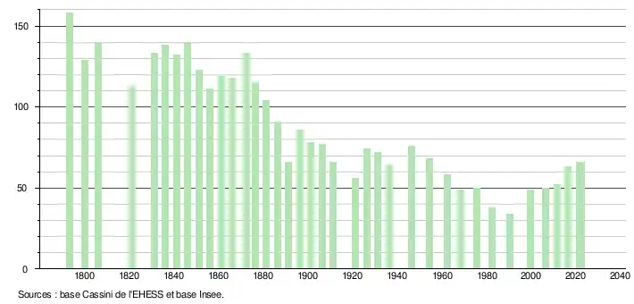 L'évolution du nombre d'habitants est connue à travers les recensements de la population effectués dans la commune depuis 1793. Pour les communes de moins de 10 000 habitants, une enquête de recensement portant sur toute la population est réalisée tous les cinq ans, les populations de référence des années intermédiaires étant quant à elles estimées par interpolation ou extrapolation[23]. Pour la commune, le premier recensement exhaustif entrant dans le cadre du nouveau dispositif a été réalisé en 2006[24].