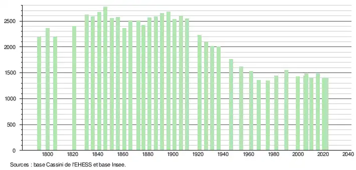 L'évolution du nombre d'habitants est connue à travers les recensements de la population effectués dans la commune depuis 1793. Pour les communes de moins de 10 000 habitants, une enquête de recensement portant sur toute la population est réalisée tous les cinq ans, les populations de référence des années intermédiaires étant quant à elles estimées par interpolation ou extrapolation[21]. Pour la commune, le premier recensement exhaustif entrant dans le cadre du nouveau dispositif a été réalisé en 2005[22].