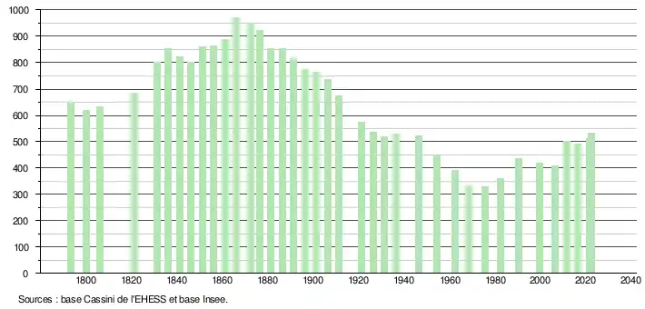 L'évolution du nombre d'habitants est connue à travers les recensements de la population effectués dans la commune depuis 1793. Pour les communes de moins de 10 000 habitants, une enquête de recensement portant sur toute la population est réalisée tous les cinq ans, les populations de référence des années intermédiaires étant quant à elles estimées par interpolation ou extrapolation[29]. Pour la commune, le premier recensement exhaustif entrant dans le cadre du nouveau dispositif a été réalisé en 2006[30].