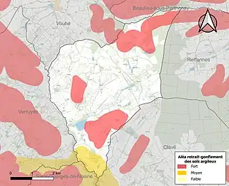 Les mouvements de terrains susceptibles de se produire sur la commune sont des tassements différentiels[16]. Le retrait-gonflement des sols argileux est susceptible d'engendrer des dommages importants aux bâtiments en cas d’alternance de périodes de sécheresse et de pluie[17]. 26,1 % de la superficie communale est en aléa moyen ou fort (54,9 % au niveau départemental et 48,5 % au niveau national)[Carte 2]. Depuis le , en application de la loi ELAN, différentes contraintes s'imposent aux vendeurs, maîtres d'ouvrages ou constructeurs de biens situés dans une zone classée en aléa moyen ou fort[Note 1],[18].