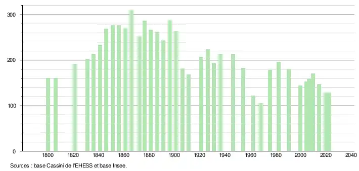 L'évolution du nombre d'habitants est connue à travers les recensements de la population effectués dans la commune depuis 1800. Pour les communes de moins de 10 000 habitants, une enquête de recensement portant sur toute la population est réalisée tous les cinq ans, les populations de référence des années intermédiaires étant quant à elles estimées par interpolation ou extrapolation[15]. Pour la commune, le premier recensement exhaustif entrant dans le cadre du nouveau dispositif a été réalisé en 2004[16].