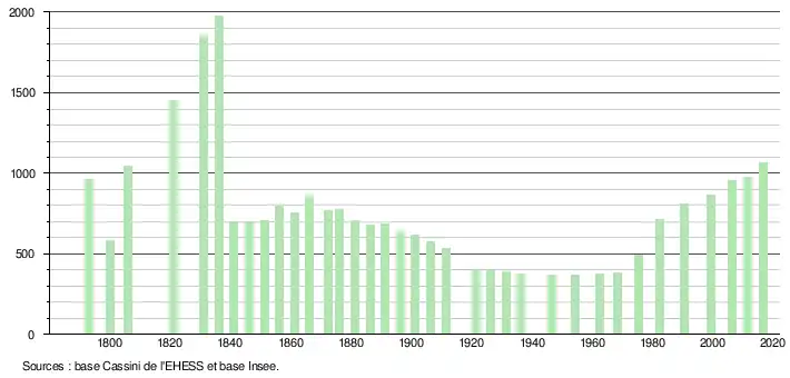 L'évolution du nombre d'habitants est connue à travers les recensements de la population effectués dans la commune depuis 1793. Pour les communes de moins de 10 000 habitants, une enquête de recensement portant sur toute la population est réalisée tous les cinq ans, les populations de référence des années intermédiaires étant quant à elles estimées par interpolation ou extrapolation[3]. Pour la commune, le premier recensement exhaustif entrant dans le cadre du nouveau dispositif a été réalisé en 2006[4].