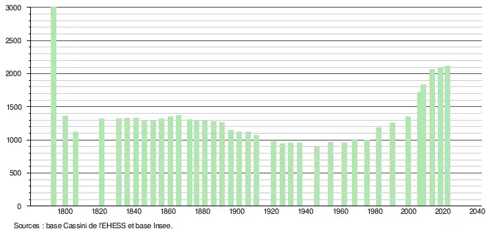 L'évolution du nombre d'habitants est connue à travers les recensements de la population effectués dans la commune depuis 1793. Pour les communes de moins de 10 000 habitants, une enquête de recensement portant sur toute la population est réalisée tous les cinq ans, les populations de référence des années intermédiaires étant quant à elles estimées par interpolation ou extrapolation[27]. Pour la commune, le premier recensement exhaustif entrant dans le cadre du nouveau dispositif a été réalisé en 2008[28].
