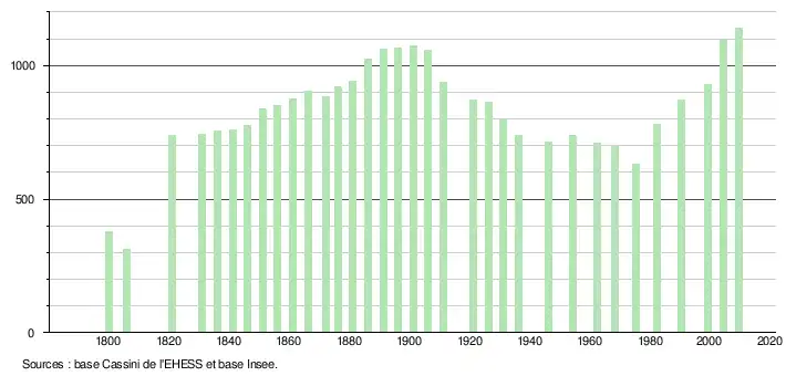 L'évolution du nombre d'habitants est connue à travers les recensements de la population effectués dans la commune depuis 1800. À partir du , les populations légales des communes sont publiées annuellement dans le cadre d'un recensement qui repose désormais sur une collecte d'information annuelle, concernant successivement tous les territoires communaux au cours d'une période de cinq ans. Pour les communes de moins de 10 000 habitants, une enquête de recensement portant sur toute la population est réalisée tous les cinq ans, les populations légales des années intermédiaires étant quant à elles estimées par interpolation ou extrapolation[8]. Pour la commune, le premier recensement exhaustif entrant dans le cadre du nouveau dispositif a été réalisé en 2004[9],[Note 3].
