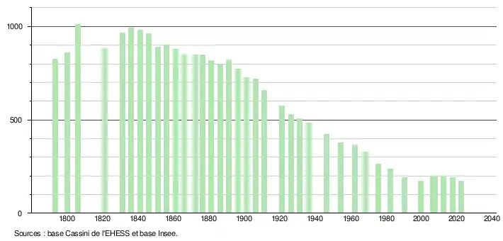 L'évolution du nombre d'habitants est connue à travers les recensements de la population effectués dans la commune depuis 1793. Pour les communes de moins de 10 000 habitants, une enquête de recensement portant sur toute la population est réalisée tous les cinq ans, les populations de référence des années intermédiaires étant quant à elles estimées par interpolation ou extrapolation[23]. Pour la commune, le premier recensement exhaustif entrant dans le cadre du nouveau dispositif a été réalisé en 2007[24].