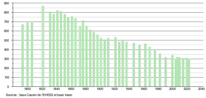 L'évolution du nombre d'habitants est connue à travers les recensements de la population effectués dans la commune depuis 1793. Pour les communes de moins de 10 000 habitants, une enquête de recensement portant sur toute la population est réalisée tous les cinq ans, les populations de référence des années intermédiaires étant quant à elles estimées par interpolation ou extrapolation[18]. Pour la commune, le premier recensement exhaustif entrant dans le cadre du nouveau dispositif a été réalisé en 2004[19].