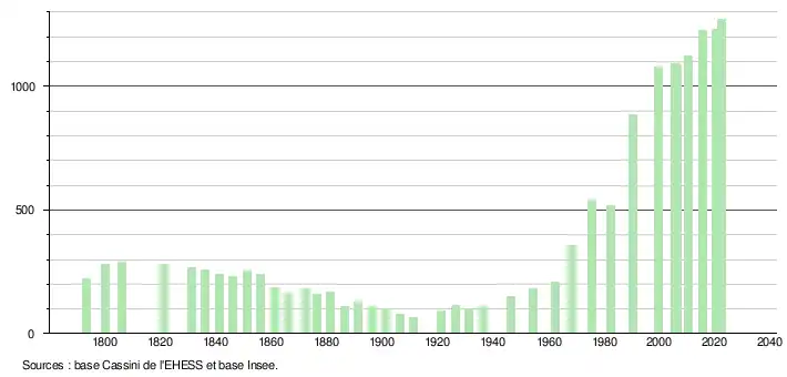 L'évolution du nombre d'habitants est connue à travers les recensements de la population effectués dans la commune depuis 1793. Pour les communes de moins de 10 000 habitants, une enquête de recensement portant sur toute la population est réalisée tous les cinq ans, les populations de référence des années intermédiaires étant quant à elles estimées par interpolation ou extrapolation[24]. Pour la commune, le premier recensement exhaustif entrant dans le cadre du nouveau dispositif a été réalisé en 2005[25].