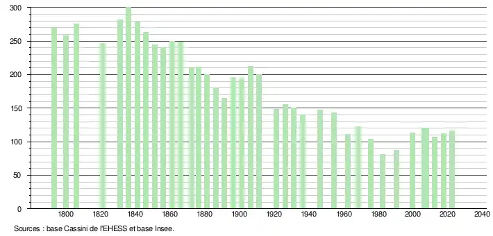 L'évolution du nombre d'habitants est connue à travers les recensements de la population effectués dans la commune depuis 1793. Pour les communes de moins de 10 000 habitants, une enquête de recensement portant sur toute la population est réalisée tous les cinq ans, les populations de référence des années intermédiaires étant quant à elles estimées par interpolation ou extrapolation[23]. Pour la commune, le premier recensement exhaustif entrant dans le cadre du nouveau dispositif a été réalisé en 2007[24].
