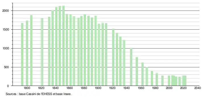L'évolution du nombre d'habitants est connue à travers les recensements de la population effectués dans la commune depuis 1793. Pour les communes de moins de 10 000 habitants, une enquête de recensement portant sur toute la population est réalisée tous les cinq ans, les populations de référence des années intermédiaires étant quant à elles estimées par interpolation ou extrapolation[24]. Pour la commune, le premier recensement exhaustif entrant dans le cadre du nouveau dispositif a été réalisé en 2004[25].