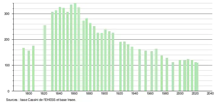 L'évolution du nombre d'habitants est connue à travers les recensements de la population effectués dans la commune depuis 1793. Pour les communes de moins de 10 000 habitants, une enquête de recensement portant sur toute la population est réalisée tous les cinq ans, les populations de référence des années intermédiaires étant quant à elles estimées par interpolation ou extrapolation[19]. Pour la commune, le premier recensement exhaustif entrant dans le cadre du nouveau dispositif a été réalisé en 2005[20].
