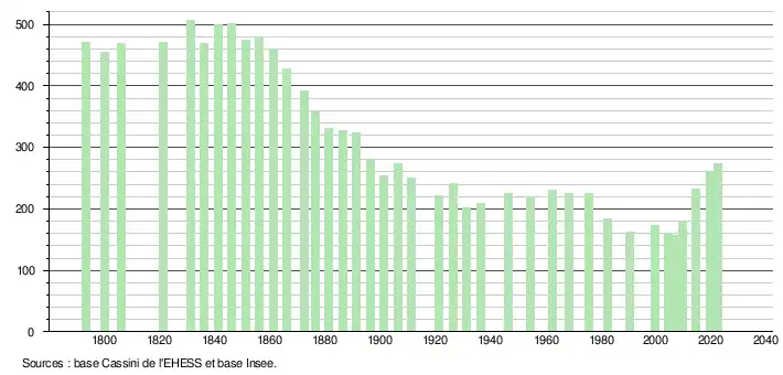 L'évolution du nombre d'habitants est connue à travers les recensements de la population effectués dans la commune depuis 1793. Pour les communes de moins de 10 000 habitants, une enquête de recensement portant sur toute la population est réalisée tous les cinq ans, les populations de référence des années intermédiaires étant quant à elles estimées par interpolation ou extrapolation[24]. Pour la commune, le premier recensement exhaustif entrant dans le cadre du nouveau dispositif a été réalisé en 2004[25].