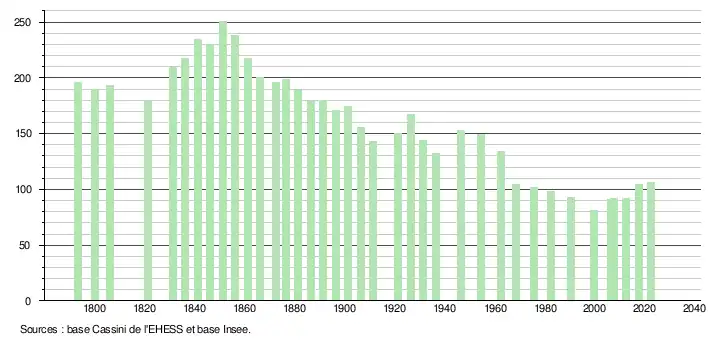 L'évolution du nombre d'habitants est connue à travers les recensements de la population effectués dans la commune depuis 1793. Pour les communes de moins de 10 000 habitants, une enquête de recensement portant sur toute la population est réalisée tous les cinq ans, les populations de référence des années intermédiaires étant quant à elles estimées par interpolation ou extrapolation[43]. Pour la commune, le premier recensement exhaustif entrant dans le cadre du nouveau dispositif a été réalisé en 2007[44].