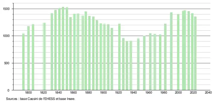 L'évolution du nombre d'habitants est connue à travers les recensements de la population effectués dans la commune depuis 1793. Pour les communes de moins de 10 000 habitants, une enquête de recensement portant sur toute la population est réalisée tous les cinq ans, les populations de référence des années intermédiaires étant quant à elles estimées par interpolation ou extrapolation[40]. Pour la commune, le premier recensement exhaustif entrant dans le cadre du nouveau dispositif a été réalisé en 2008[41].