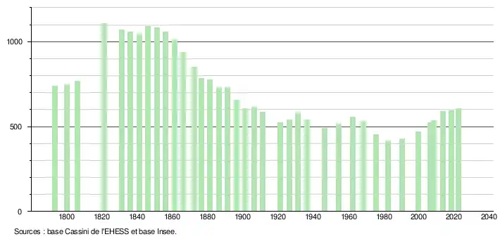 L'évolution du nombre d'habitants est connue à travers les recensements de la population effectués dans la commune depuis 1793. Pour les communes de moins de 10 000 habitants, une enquête de recensement portant sur toute la population est réalisée tous les cinq ans, les populations de référence des années intermédiaires étant quant à elles estimées par interpolation ou extrapolation[39]. Pour la commune, le premier recensement exhaustif entrant dans le cadre du nouveau dispositif a été réalisé en 2008[40].