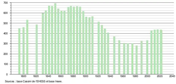 L'évolution du nombre d'habitants est connue à travers les recensements de la population effectués dans la commune depuis 1793. Pour les communes de moins de 10 000 habitants, une enquête de recensement portant sur toute la population est réalisée tous les cinq ans, les populations de référence des années intermédiaires étant quant à elles estimées par interpolation ou extrapolation[14]. Pour la commune, le premier recensement exhaustif entrant dans le cadre du nouveau dispositif a été réalisé en 2006[15].