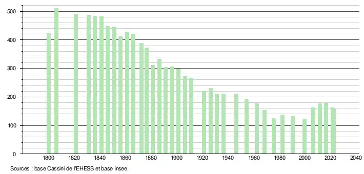 L'évolution du nombre d'habitants est connue à travers les recensements de la population effectués dans la commune depuis 1800. Pour les communes de moins de 10 000 habitants, une enquête de recensement portant sur toute la population est réalisée tous les cinq ans, les populations de référence des années intermédiaires étant quant à elles estimées par interpolation ou extrapolation[24]. Pour la commune, le premier recensement exhaustif entrant dans le cadre du nouveau dispositif a été réalisé en 2006[25].