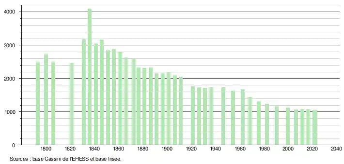 L'évolution du nombre d'habitants est connue à travers les recensements de la population effectués dans la commune depuis 1793. Pour les communes de moins de 10 000 habitants, une enquête de recensement portant sur toute la population est réalisée tous les cinq ans, les populations de référence des années intermédiaires étant quant à elles estimées par interpolation ou extrapolation[30]. Pour la commune, le premier recensement exhaustif entrant dans le cadre du nouveau dispositif a été réalisé en 2006[31].
