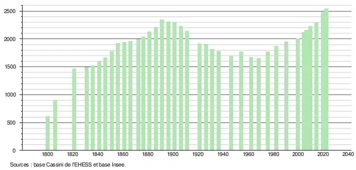 L'évolution du nombre d'habitants est connue à travers les recensements de la population effectués dans la commune depuis 1800. Pour les communes de moins de 10 000 habitants, une enquête de recensement portant sur toute la population est réalisée tous les cinq ans, les populations de référence des années intermédiaires étant quant à elles estimées par interpolation ou extrapolation[20]. Pour la commune, le premier recensement exhaustif entrant dans le cadre du nouveau dispositif a été réalisé en 2004[21].
