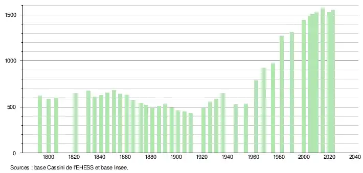 L'évolution du nombre d'habitants est connue à travers les recensements de la population effectués dans la commune depuis 1793. Pour les communes de moins de 10 000 habitants, une enquête de recensement portant sur toute la population est réalisée tous les cinq ans, les populations de référence des années intermédiaires étant quant à elles estimées par interpolation ou extrapolation[16]. Pour la commune, le premier recensement exhaustif entrant dans le cadre du nouveau dispositif a été réalisé en 2004[17].