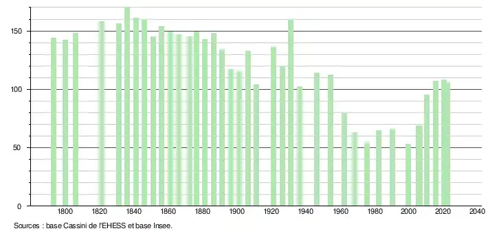 L'évolution du nombre d'habitants est connue à travers les recensements de la population effectués dans la commune depuis 1793. Pour les communes de moins de 10 000 habitants, une enquête de recensement portant sur toute la population est réalisée tous les cinq ans, les populations de référence des années intermédiaires étant quant à elles estimées par interpolation ou extrapolation[15]. Pour la commune, le premier recensement exhaustif entrant dans le cadre du nouveau dispositif a été réalisé en 2005[16].