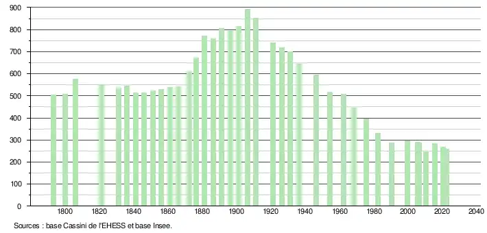 L'évolution du nombre d'habitants est connue à travers les recensements de la population effectués dans la commune depuis 1793. Pour les communes de moins de 10 000 habitants, une enquête de recensement portant sur toute la population est réalisée tous les cinq ans, les populations de référence des années intermédiaires étant quant à elles estimées par interpolation ou extrapolation[23]. Pour la commune, le premier recensement exhaustif entrant dans le cadre du nouveau dispositif a été réalisé en 2005[24].