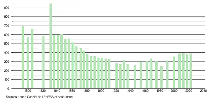 L'évolution du nombre d'habitants est connue à travers les recensements de la population effectués dans la commune depuis 1793. Pour les communes de moins de 10 000 habitants, une enquête de recensement portant sur toute la population est réalisée tous les cinq ans, les populations de référence des années intermédiaires étant quant à elles estimées par interpolation ou extrapolation[27]. Pour la commune, le premier recensement exhaustif entrant dans le cadre du nouveau dispositif a été réalisé en 2007[28].