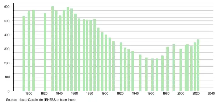 L'évolution du nombre d'habitants est connue à travers les recensements de la population effectués dans la commune depuis 1793. Pour les communes de moins de 10 000 habitants, une enquête de recensement portant sur toute la population est réalisée tous les cinq ans, les populations de référence des années intermédiaires étant quant à elles estimées par interpolation ou extrapolation[16]. Pour la commune, le premier recensement exhaustif entrant dans le cadre du nouveau dispositif a été réalisé en 2008[17].