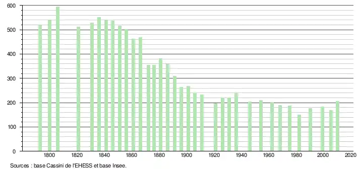 L'évolution du nombre d'habitants est connue à travers les recensements de la population effectués dans la commune depuis 1793. À partir du , les populations légales des communes sont publiées annuellement dans le cadre d'un recensement qui repose désormais sur une collecte d'information annuelle, concernant successivement tous les territoires communaux au cours d'une période de cinq ans. Pour les communes de moins de 10 000 habitants, une enquête de recensement portant sur toute la population est réalisée tous les cinq ans, les populations légales des années intermédiaires étant quant à elles estimées par interpolation ou extrapolation[15]. Pour la commune, le premier recensement exhaustif entrant dans le cadre du nouveau dispositif a été réalisé en 2005[16],[Note 3].