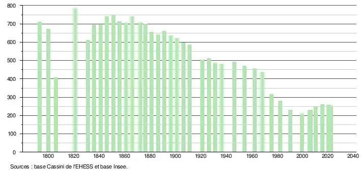 L'évolution du nombre d'habitants est connue à travers les recensements de la population effectués dans la commune depuis 1793. Pour les communes de moins de 10 000 habitants, une enquête de recensement portant sur toute la population est réalisée tous les cinq ans, les populations de référence des années intermédiaires étant quant à elles estimées par interpolation ou extrapolation[16]. Pour la commune, le premier recensement exhaustif entrant dans le cadre du nouveau dispositif a été réalisé en 2005[17].