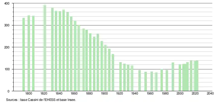 L'évolution du nombre d'habitants est connue à travers les recensements de la population effectués dans la commune depuis 1793. Pour les communes de moins de 10 000 habitants, une enquête de recensement portant sur toute la population est réalisée tous les cinq ans, les populations de référence des années intermédiaires étant quant à elles estimées par interpolation ou extrapolation[16]. Pour la commune, le premier recensement exhaustif entrant dans le cadre du nouveau dispositif a été réalisé en 2004[17].