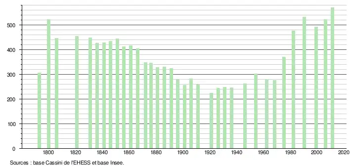 - ↑ Par convention dans Wikipédia, le principe a été retenu de n’afficher dans le tableau des recensements et le graphique, pour les populations légales postérieures à 1999, que les populations correspondant à une enquête exhaustive de recensement pour les communes de moins de 10 000 habitants, et que les populations des années 2006, 2011, 2016, etc. pour les communes de plus de 10 000 habitants, ainsi que la dernière population légale publiée par l’Insee pour l'ensemble des communes.