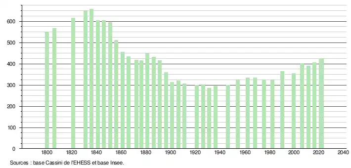 L'évolution du nombre d'habitants est connue à travers les recensements de la population effectués dans la commune depuis 1800. Pour les communes de moins de 10 000 habitants, une enquête de recensement portant sur toute la population est réalisée tous les cinq ans, les populations de référence des années intermédiaires étant quant à elles estimées par interpolation ou extrapolation[24]. Pour la commune, le premier recensement exhaustif entrant dans le cadre du nouveau dispositif a été réalisé en 2006[25].