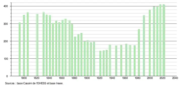 L'évolution du nombre d'habitants est connue à travers les recensements de la population effectués dans la commune depuis 1793. Pour les communes de moins de 10 000 habitants, une enquête de recensement portant sur toute la population est réalisée tous les cinq ans, les populations de référence des années intermédiaires étant quant à elles estimées par interpolation ou extrapolation[25]. Pour la commune, le premier recensement exhaustif entrant dans le cadre du nouveau dispositif a été réalisé en 2006[26].