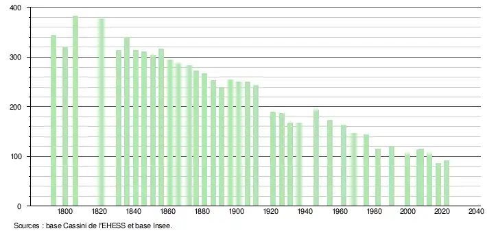 L'évolution du nombre d'habitants est connue à travers les recensements de la population effectués dans la commune depuis 1793. Pour les communes de moins de 10 000 habitants, une enquête de recensement portant sur toute la population est réalisée tous les cinq ans, les populations de référence des années intermédiaires étant quant à elles estimées par interpolation ou extrapolation[23]. Pour la commune, le premier recensement exhaustif entrant dans le cadre du nouveau dispositif a été réalisé en 2007[24].