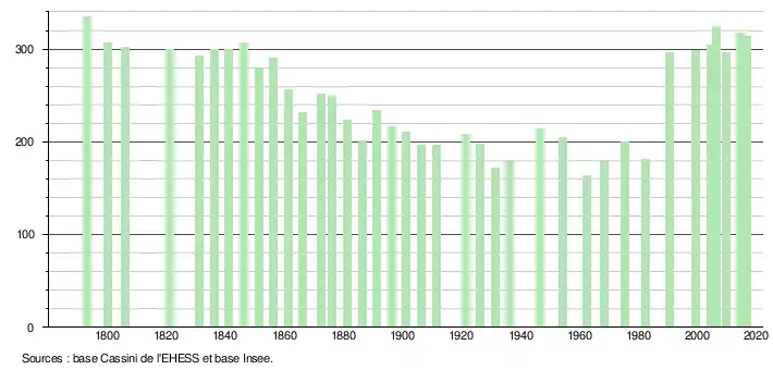 L'évolution du nombre d'habitants est connue à travers les recensements de la population effectués dans la commune depuis 1793. Pour les communes de moins de 10 000 habitants, une enquête de recensement portant sur toute la population est réalisée tous les cinq ans, les populations de référence des années intermédiaires étant quant à elles estimées par interpolation ou extrapolation[6]. Pour la commune, le premier recensement exhaustif entrant dans le cadre du nouveau dispositif a été réalisé en 2004[7].