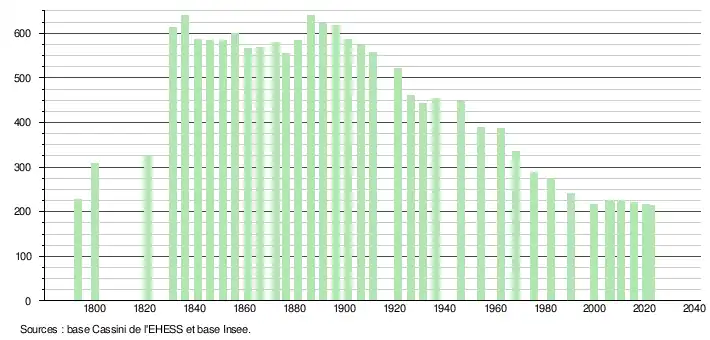 L'évolution du nombre d'habitants est connue à travers les recensements de la population effectués dans la commune depuis 1793. Pour les communes de moins de 10 000 habitants, une enquête de recensement portant sur toute la population est réalisée tous les cinq ans, les populations de référence des années intermédiaires étant quant à elles estimées par interpolation ou extrapolation[23]. Pour la commune, le premier recensement exhaustif entrant dans le cadre du nouveau dispositif a été réalisé en 2005[24].