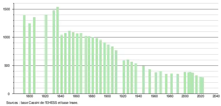 L'évolution du nombre d'habitants est connue à travers les recensements de la population effectués dans la commune depuis 1793. Pour les communes de moins de 10 000 habitants, une enquête de recensement portant sur toute la population est réalisée tous les cinq ans, les populations de référence des années intermédiaires étant quant à elles estimées par interpolation ou extrapolation[33]. Pour la commune, le premier recensement exhaustif entrant dans le cadre du nouveau dispositif a été réalisé en 2004[34].