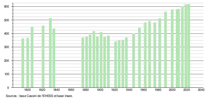 | L'évolution du nombre d'habitants est connue à travers les recensements de la population effectués dans la commune depuis 1793. Pour les communes de moins de 10 000 habitants, une enquête de recensement portant sur toute la population est réalisée tous les cinq ans, les populations de référence des années intermédiaires étant quant à elles estimées par interpolation ou extrapolation[26]. Pour la commune, le premier recensement exhaustif entrant dans le cadre du nouveau dispositif a été réalisé en 2008[27]. En 2022, la commune comptait 618 habitants[Note 7], en évolution de +1,48 % par rapport à 2016 (Lot-et-Garonne : −0,18 %, France hors Mayotte : +2,11 %). |