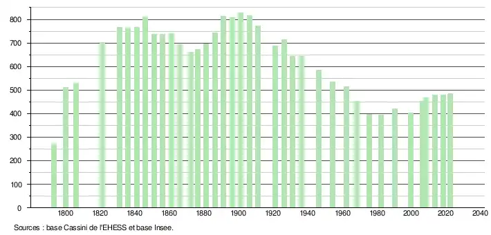 L'évolution du nombre d'habitants est connue à travers les recensements de la population effectués dans la commune depuis 1793. Pour les communes de moins de 10 000 habitants, une enquête de recensement portant sur toute la population est réalisée tous les cinq ans, les populations de référence des années intermédiaires étant quant à elles estimées par interpolation ou extrapolation[20]. Pour la commune, le premier recensement exhaustif entrant dans le cadre du nouveau dispositif a été réalisé en 2008[21].