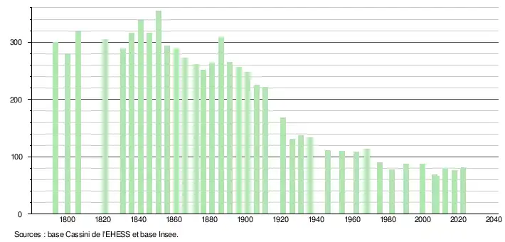 | L'évolution du nombre d'habitants est connue à travers les recensements de la population effectués dans la commune depuis 1793. Pour les communes de moins de 10 000 habitants, une enquête de recensement portant sur toute la population est réalisée tous les cinq ans, les populations de référence des années intermédiaires étant quant à elles estimées par interpolation ou extrapolation[19]. Pour la commune, le premier recensement exhaustif entrant dans le cadre du nouveau dispositif a été réalisé en 2007[20]. En 2022, la commune comptait 81 habitants[Note 2], en évolution de +3,85 % par rapport à 2016 (Corrèze : −0,59 %, France hors Mayotte : +2,11 %). |