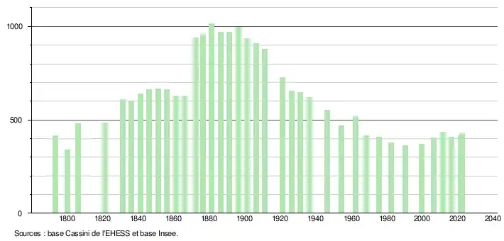 - ↑ Fiches Insee - Populations de référence de la commune pour les années 2006, 2007, 2008, 2009, 2010, 2011, 2012, 2013, 2014, 2015, 2016, 2017, 2018, 2019, 2020, 2021 et 2022.