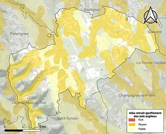 La commune est vulnérable au risque de mouvements de terrains constitué principalement du retrait-gonflement des sols argileux[15]. Cet aléa est susceptible d'engendrer des dommages importants aux bâtiments en cas d’alternance de périodes de sécheresse et de pluie. 50,3 % de la superficie communale est en aléa moyen ou fort (26,8 % au niveau départemental et 48,5 % au niveau national). Sur les 168 bâtiments dénombrés sur la commune en 2019, 91 sont en aléa moyen ou fort, soit 54 %, à comparer aux 36 % au niveau départemental et 54 % au niveau national. Une cartographie de l'exposition du territoire national au retrait gonflement des sols argileux est disponible sur le site du BRGM[16],[Carte 2].